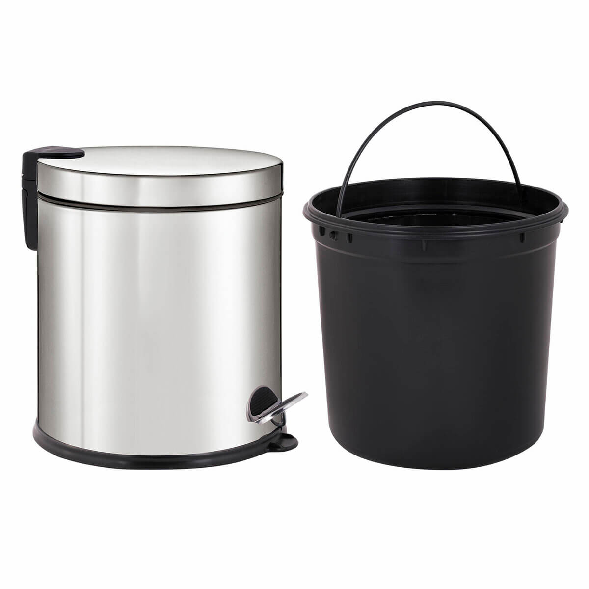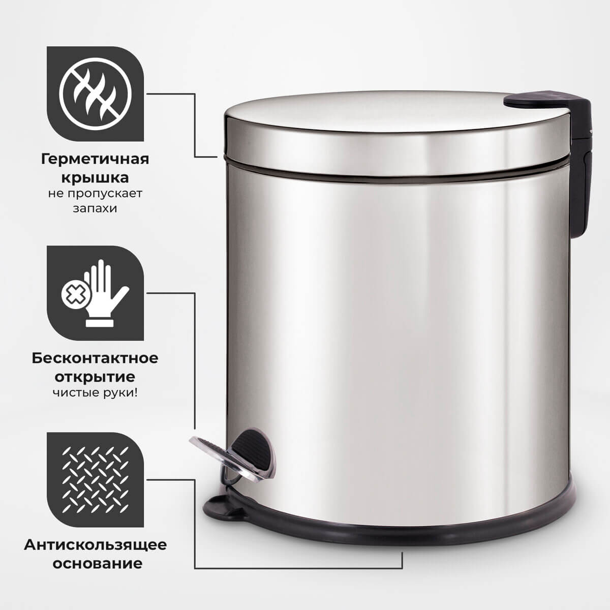 Внутреннее съемное пластиковое ведро оснащено удобной рукояткой для легкости извлечения мусора. Ведро изготовлено из нержавеющей стали с антикоррозийным покрытием, что обеспечивает долгий срок службы. Антискользящее основание обеспечивает устойчивость.